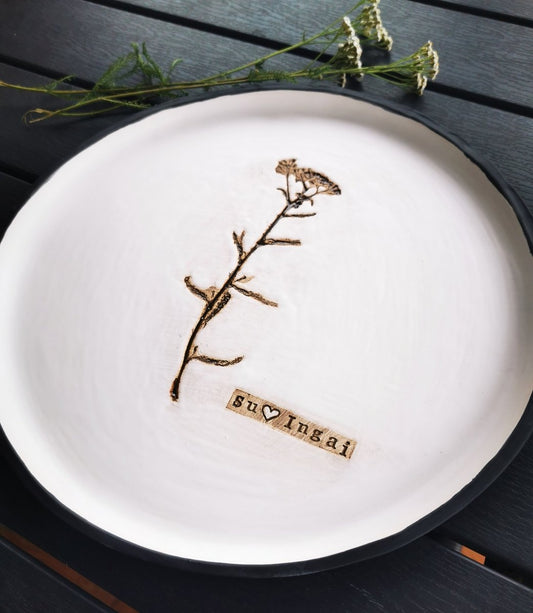 Rankų darbo lėkštė su augalo įspaudu „Kraujažolė“ Su jūsų norimu užrašu